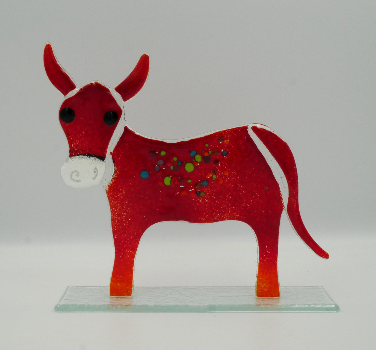 Die Farbe bleibt dauerhaft erhalten – dank der Fusingtechnik. Dabei wird transparentes Glas zugeschnitten, anschließend mit kompatiblem Farbglaspulver bestreut und in einem Brennvorgang verschmolzen. Durch dieses Verfahren entsteht die Farbe im Glas selbst, wodurch sie nicht verblassen oder abblättern kann.