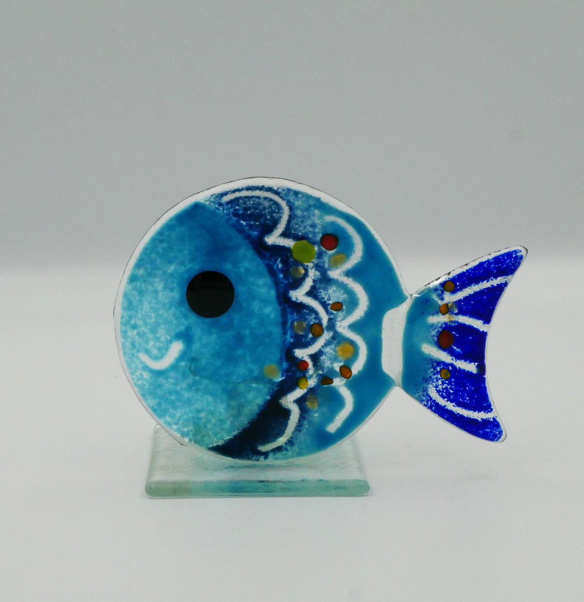 Dieser handgefertigte Fisch bezaubert mit seinem freundlichen Lächeln und lebedigem blau.
